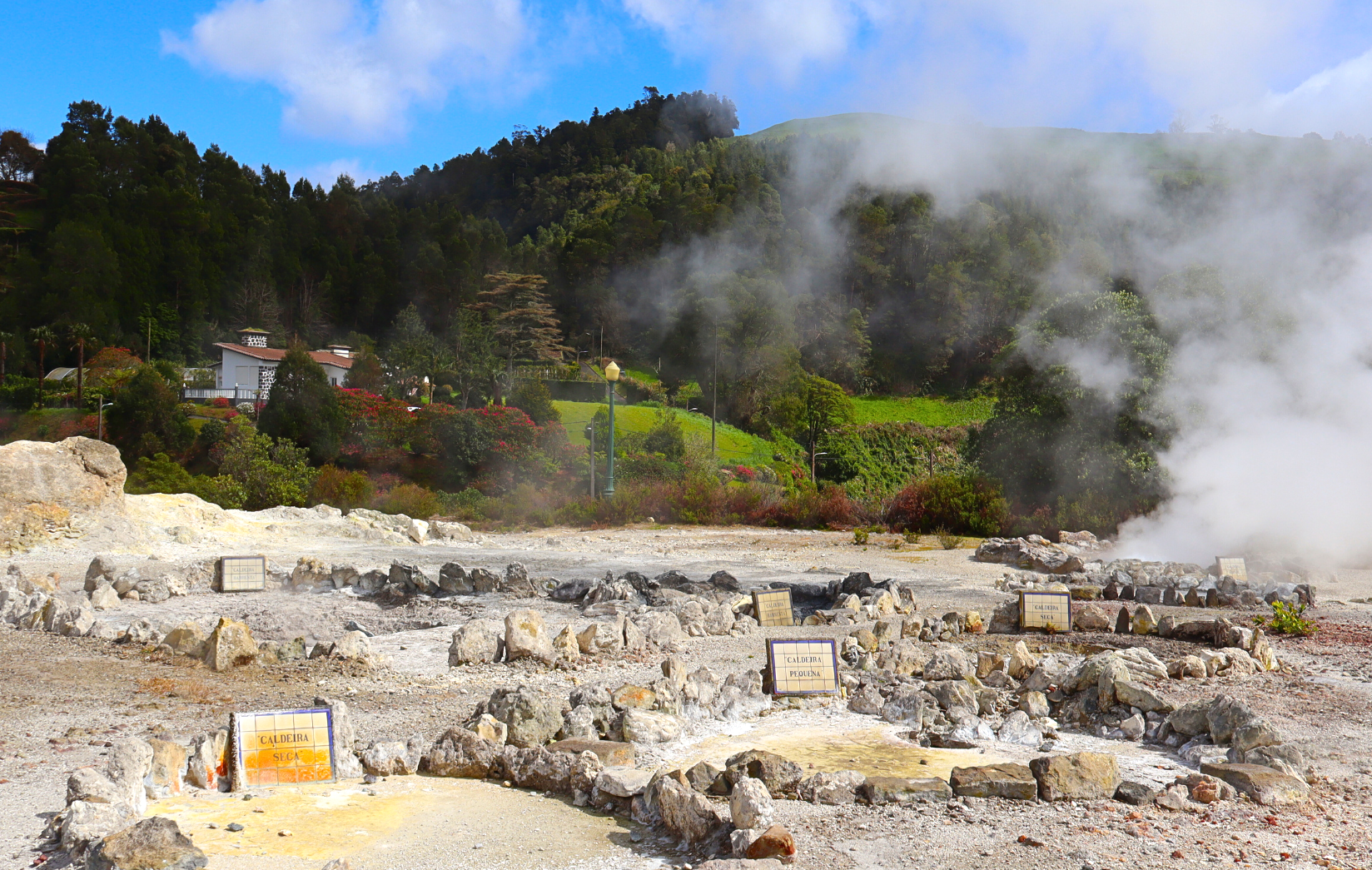 Caminhe pelos passadiços de madeira e observe as diferentes manifestações geotérmicas: nascentes de água fervente, lamas em ebulição, e vapores sulfurosos que emergem de fissuras na terra. O contraste entre a intensa atividade termal e a vegetação verdejante ao redor cria uma paisagem quase extraterrestre. Este é também o local onde muitos restaurantes enterram os seus tachos para cozinhar o tradicional cozido das Furnas.